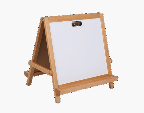 Die Tischstaffelei hat eine Kreidetafel und eine Whiteboard Seite jeweils mit Klemme, an d...