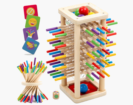 In den Holzturm werden durch die Aussparungen in den Kunststoffseitenteilen farbige Säbe ...