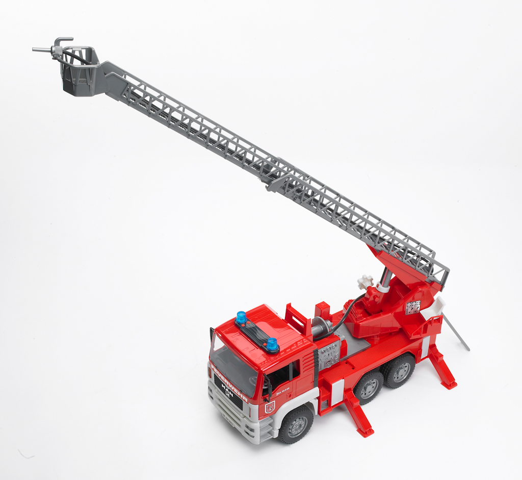 Das kippbare Fahrerhaus des MAN Feuerwehr-LKWs mit Drehleiter und Wasserpumpe ermöglicht die Sicht auf den Motorblock. Die Spiegel des Fahrerhauses lassen sich ausklappen und der integrierte Wassertank befüllen. Der Wasserschlauch kann aufgewickelt werden und besitzt am Ende eine voll funktionsfähige Wasserspritze. Die Drehleiter inkl. Rettungskorb kann durch ein Handrad ausgefahren und höhenverstellt werden. Vier Stützblöcke bieten sicheren Stand. Das Light and Sound Module Art.-Nr.: 02801 mit vier unterschiedlichen Funktionen Hupe, Motorengeräusch, Blinklicht und Sirenengeräusch ist im Lieferumfang enthalten. Profilreifen runden das Bild ab.