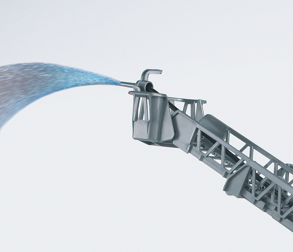 mit ausfahrbarer Drehleiter, Wasserpumpe und Ausleger. Kunststoff (ABS, PE, PS) rot+silber. 3-achsig, 47*17,5*24,2 cm.