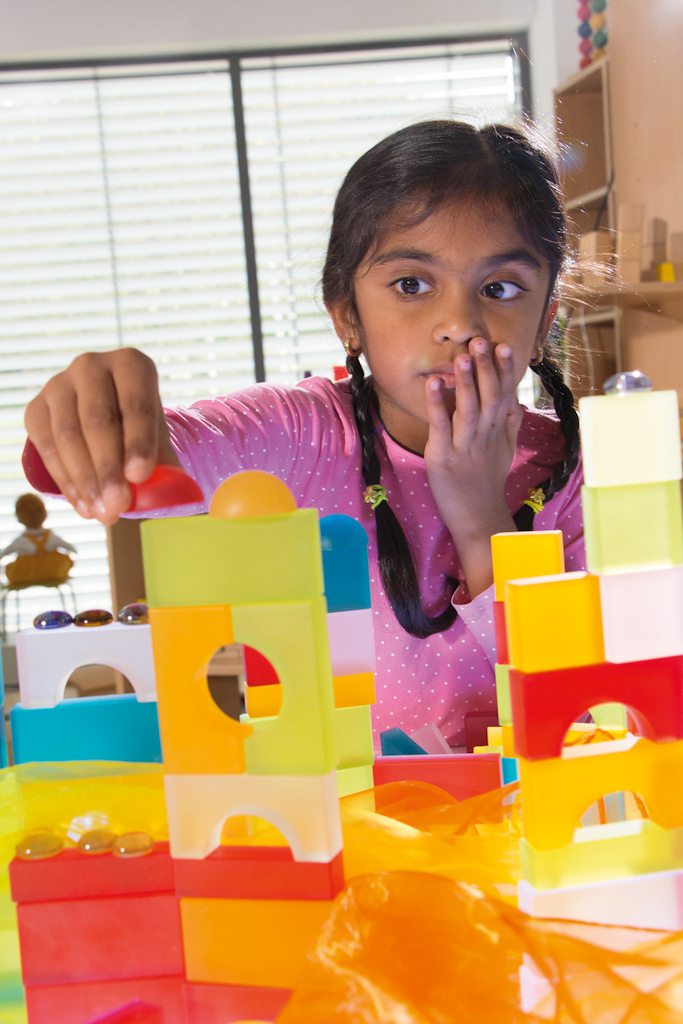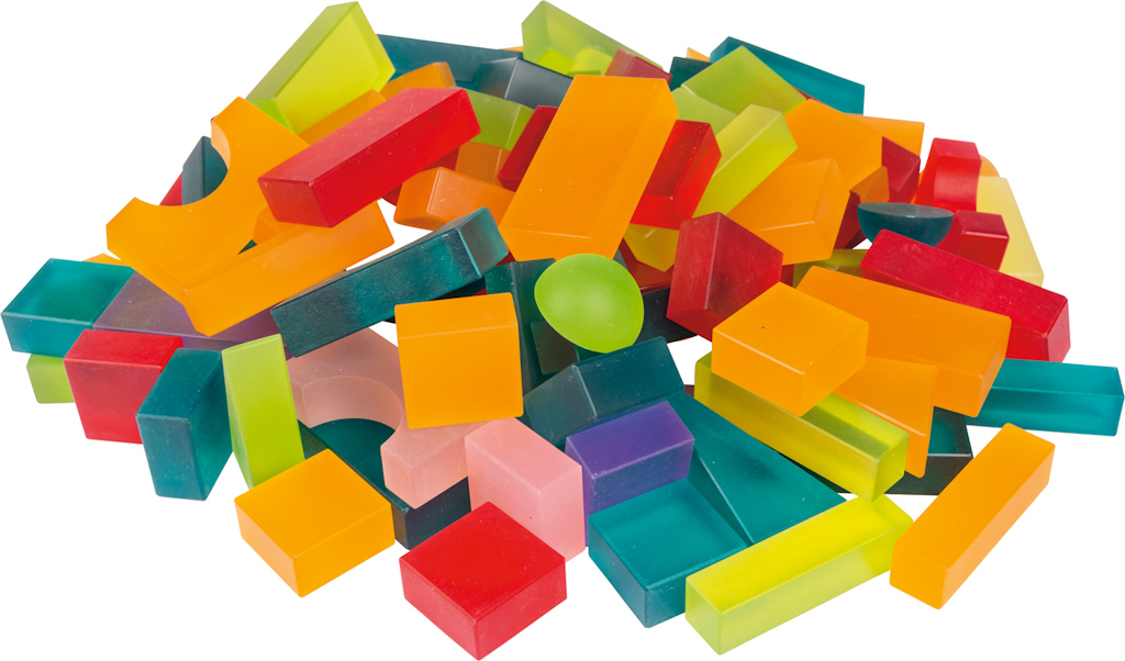 Mit den Lichtbausteinen in dem transparent schimmernden Material ergeben sich ganz neue Eindrücke in der Baugestaltung. Die Leuchtkraft der Farben ändert sich je nach Lichtquelle und -intensität sowie nach den Farben des jeweiligen Hinter- und Untergrundes. Die Bausteine in Größe und Formen der klassischen Holzbausteine lassen sich gut mit diesen verbauen und kombinieren und erweitern die Gestaltungsmöglichkeiten enorm. So bereitet das Konstruieren damit auch über das Vorschulalter hinaus noch Freude.