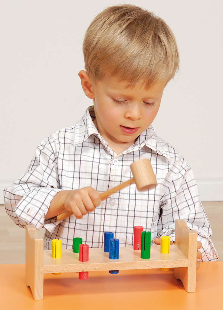 Klassisches Spielzeug, bei dem Kinder ihre Augen-Hand-Koordination trainieren können und das immer wieder Spaß macht. Die Holzstäbe sind an den Enden eingesägt, was zu einem gewissen Widerstand beim einklopfen führt.