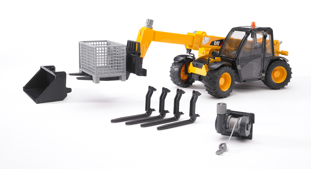 Die Frontladerzubehörteile sind zur Spielergänzung kombinierbar mit allen Traktoren der Profi-Serie und dem Manitou, Caterpillar oder JLG Teleskoplader mit Frontlader. Das Set besteht aus einem Adapter für Zubehörteile, einer Gitterpalette, einer Seilwinde und vier Heu- und zwei Palettengabeln.