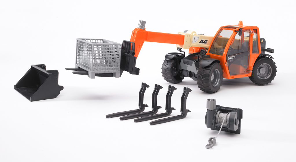 Der maßstabsgetreue Teleskoplader verfügt über viele gut zu bedienende Funktionen: 4-Radlenkung mittels silbernem Griffstück, Höhenverstell- und ausfahrbarer Teleskoparm und Winkelverstellung der Schaufel. Die Schaufel kann gegen andere Werkzeuge ausgetauscht werden. Die Fahrerkabine ist aus transparentem und bruchsicherem Polycarbonat mit einer Tür zum Öffnen und Schließen. Die Anhängekupplung kann abgenommen werden.
