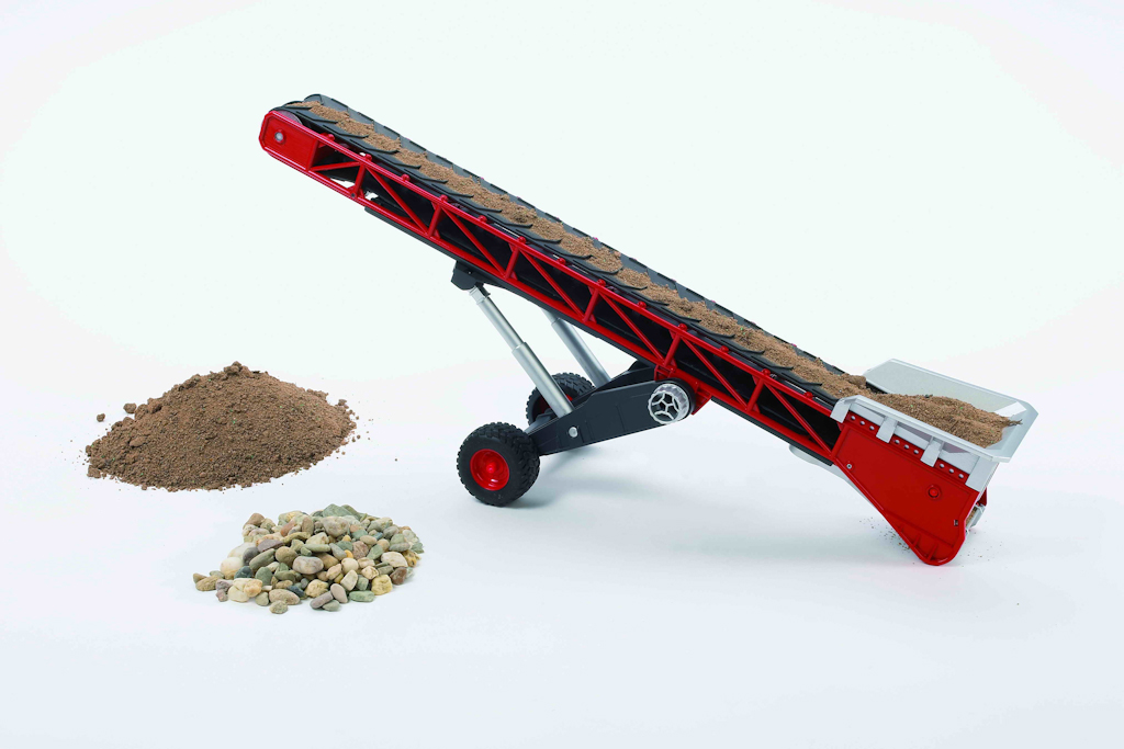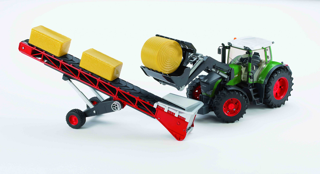 Modellgerecht ist das Förderband mit verschiedenen Funktionen ausgestattet: handbetriebenes (Kurbel) Weichkunststoffband, V-förmiges Gummiband mit realistischen Förderstegen (fördert loses Schüttgut und Ballen), höhenverstellbares Fahrgestell (verstellbare Schütthöhe 11-31 cm). Klappbare Deichsel, passt auf LKW und Traktoren-Kupplungen.
