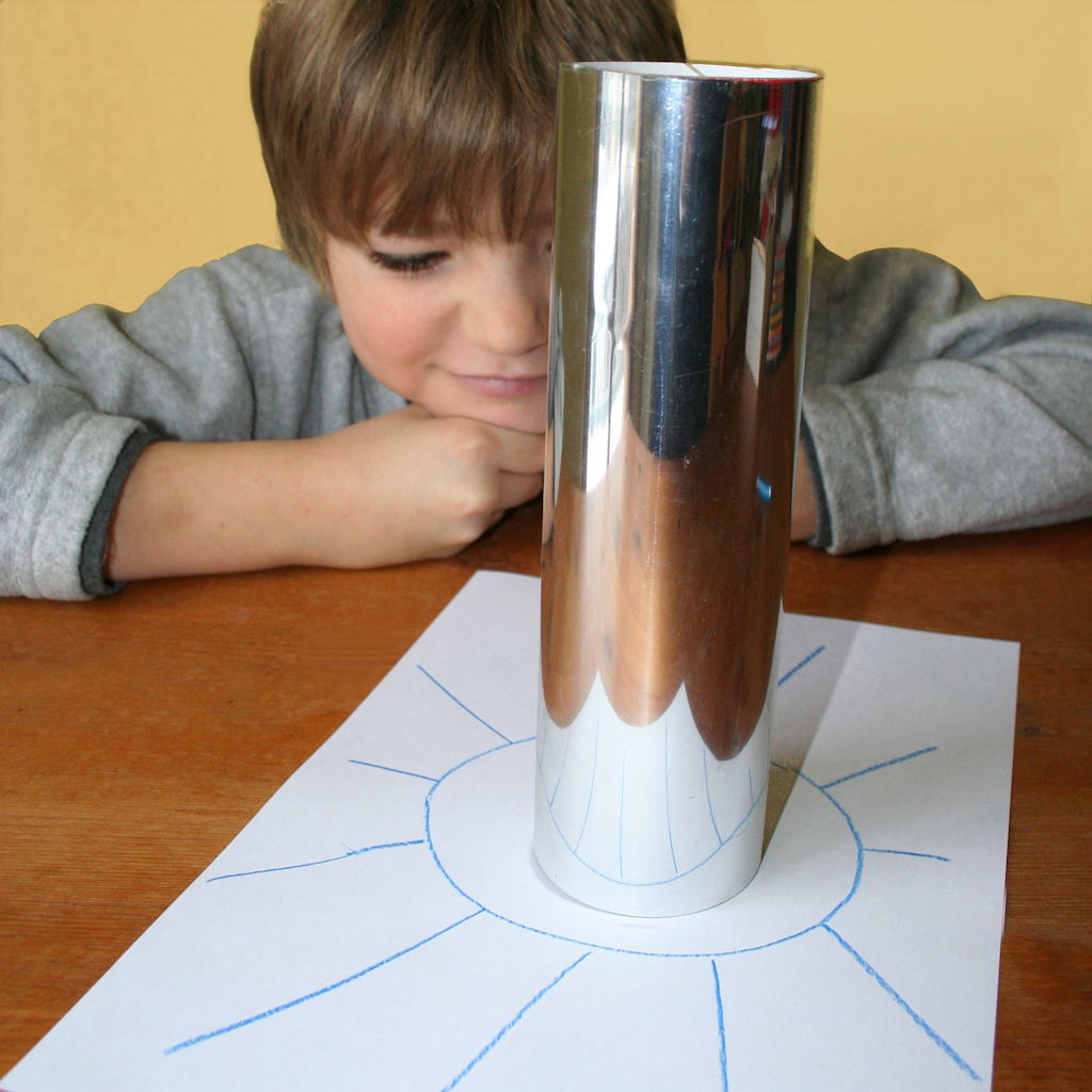 Mit Hilfe der zwei biegsamen Spiegel wird die Pappröhre entweder zum innen verspiegelten Rohr oder zum gebogenen Außenspiegel. Durchschauen, Gegenstände hinein oder vor den Außenspiegel legen, immer wieder ergeben sich interessante und überraschende Ansichten und regen zu vielen weiteren Experimenten an.
