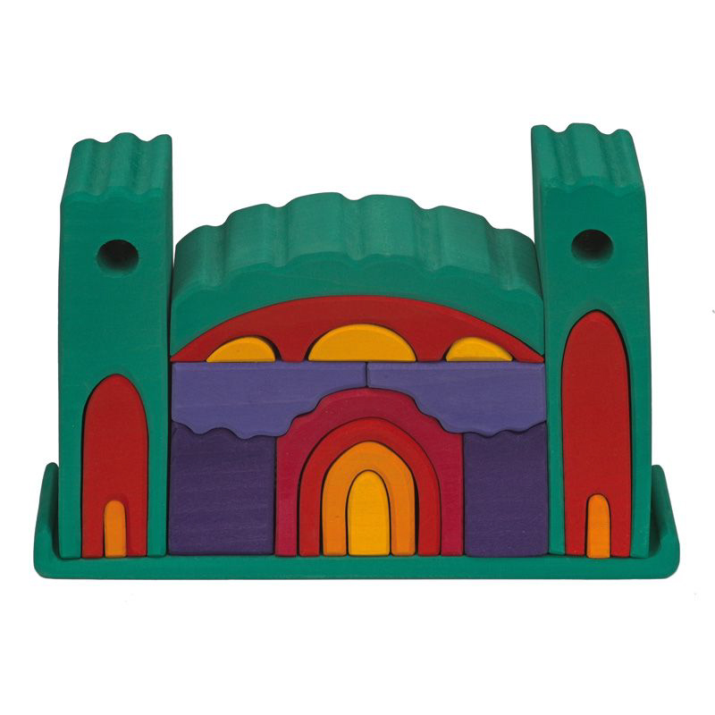 Die Bauelemente haben zusammengesetzt die Anmutung eines Schlosses. Jedes Teil hat seinen bestimmten Platz, die zusammen ein räumliches Puzzle ergeben. Vordergründig regen die Teile aber zum freien Gestalten an oder sie werden als Ergänzung zu Natur-Grundbausteinen verwendet.
