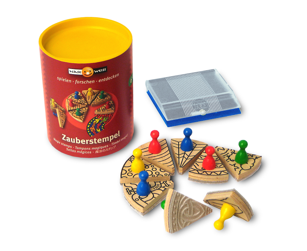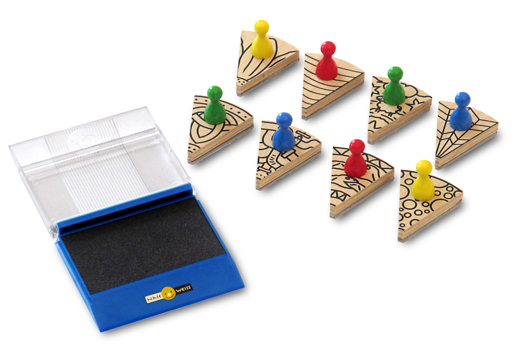 8 Stempel Naturkautschuk, Grundkörper Buche, Griff Buche lackiert. 1 Stempelkissen PS+PUR Weichschaum. In Pappdose mit PE-Deckel.
