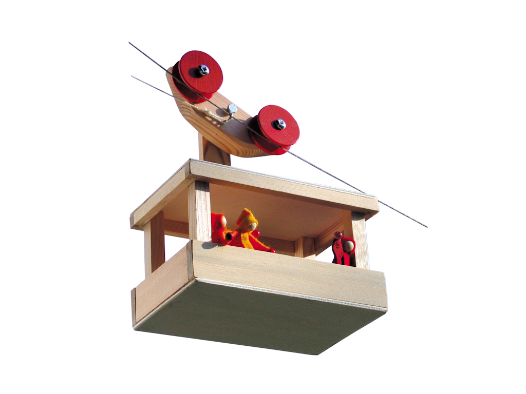 Mit dem Bausatz kann eine Seilbahn gebaut werden, in der kleines Transportmaterial oder Püppchen transportiert werden können. Kinder können so das Prinzip einer Seilbahn kennen lernen. Zusammenbau ab 9 Jahre, Spiel ab 5 Jahre. Die Stütze ist eine Erweiterung zur Seilbahn und hält das Tragseil der großen Seilbahn in sicherem Abstand vom Boden. Sie ist für den Betrieb mit einem oder auch zwei Wagen vorgesehen und kann auch als Mittelstation benützt werden. Eine weitere Erweiterung: Die Winde für einen Wagen der Großen Seilbahn wickelt das Zugseil von einem Wagen auf. Eine Sperrklinke ermöglicht jederzeit eine Fahrtunterbrechung. Aus denselben Teilen kann eine Station aufgebaut werden. Diese wird "oben am Berg" montiert für den Pendelverkehr mit zwei Gondeln.