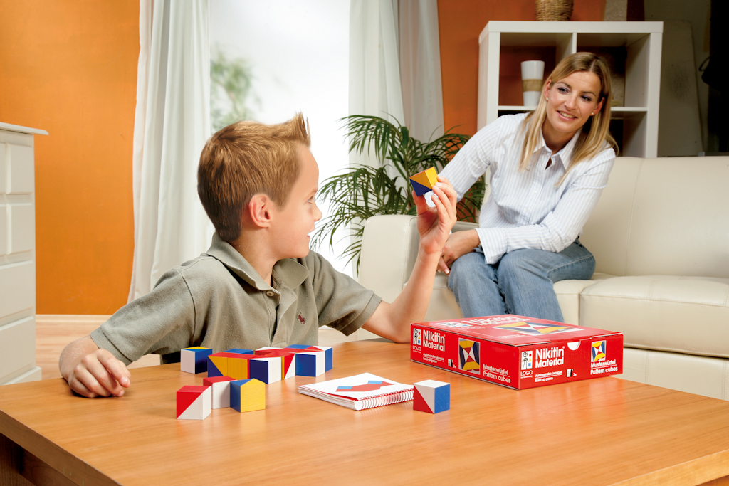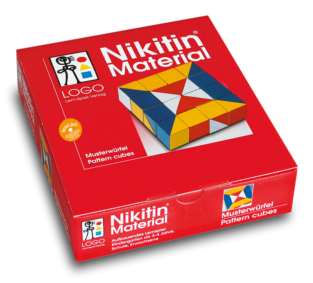 Die Musterwürfel sind ein gutes Beispiel für ein sich weiterentwickelndes Spiel: dreijährige Kinder legen mit den Würfeln zunächst verschiedene, selbstentworfene Muster. Nach dem vertraut werden mit dem Material kann mit einfachen Aufgaben des Vorlagenheftes begonnen werden. Die beiden Aufgabenhefte bieten Muster für jede Altersgruppe und sind auch für Erwachsene oft noch eine Herausforderung. Das Spiel hat durchaus einen didaktischen Anspruch, eine zu hohe Erwartungshaltung von Eltern an die Leistung ihrer Kinder, kann sich aber schnell als Spielverderber bemerkbar machen. Besonders für Institutionen geeignet.