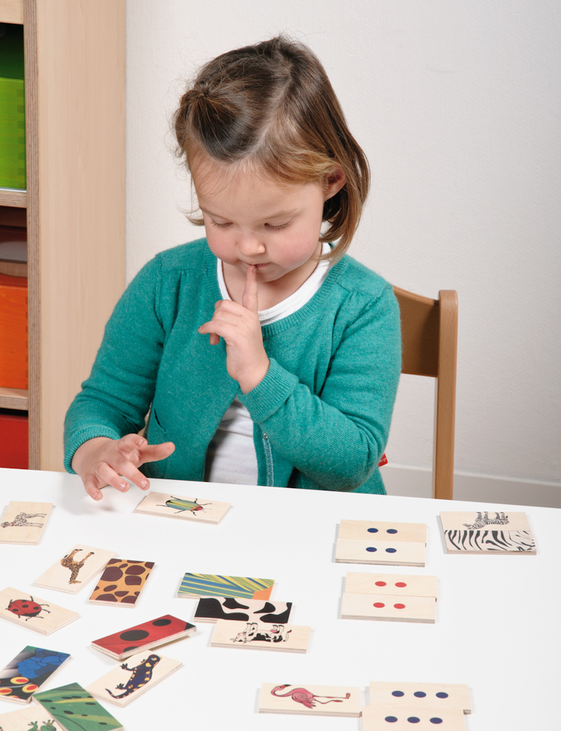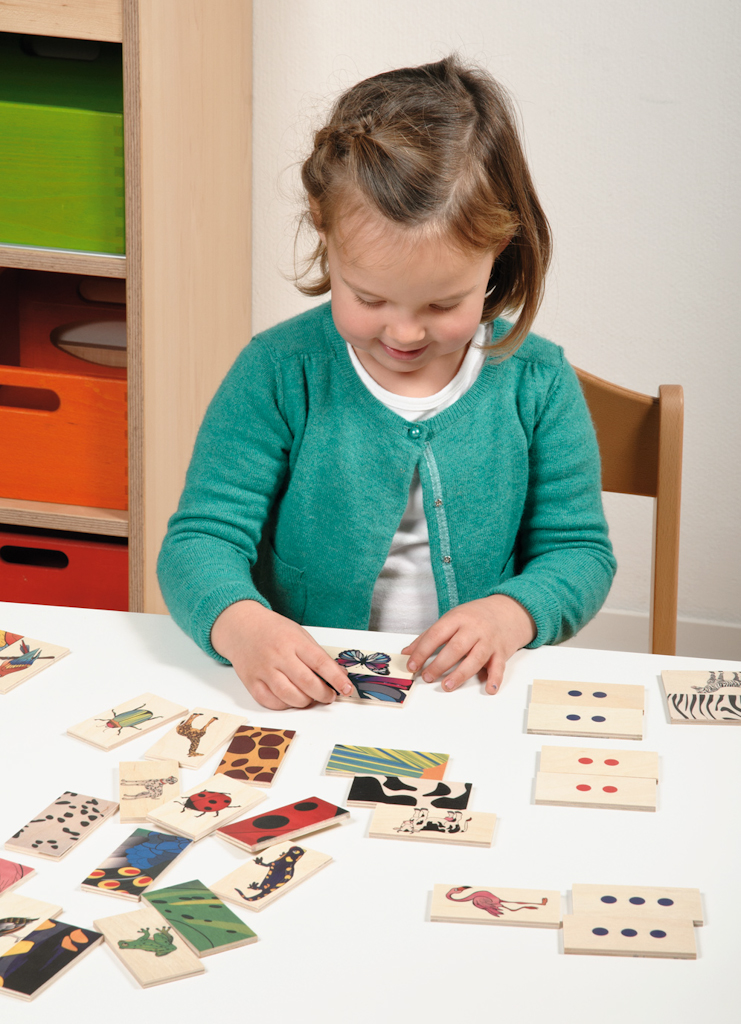 Die Holztäfelchen bilden 15 Paare mit jeweils einem Tier und einem dazu passenden Tierkleid z.B. aus Fell oder Federn, die Kinder nach drei verschiedenen Spielregeln zusammen suchen. Mit Kontrollpunkten auf der Rückseite der Täfelchen ist eine Selbstkontrolle möglich. Das Spiel regt unter anderem zum genauen Wahrnehmen und zum Sprechen an.