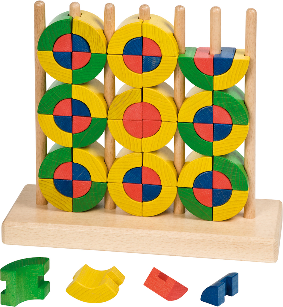 Diese Art Steckspiel ist eine besondere Herausforderung an das dreidimensionale Denken und Abstraktionsvermögen. Logisches und strategisches Denken, Konzentration sowie Feinmotorik werden dabei gefördert.