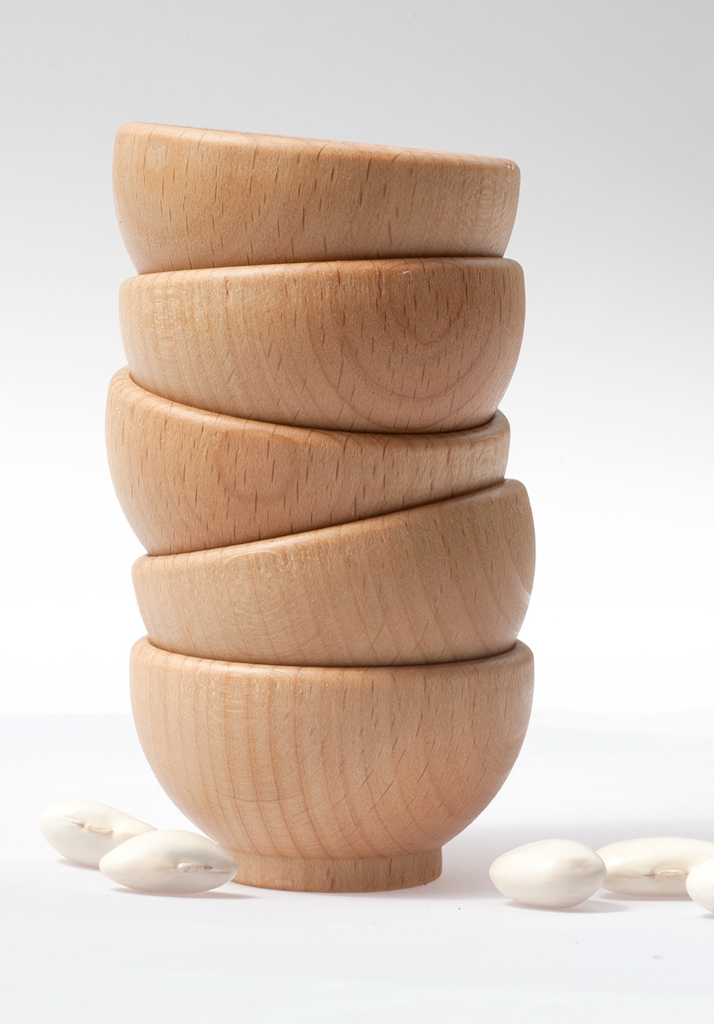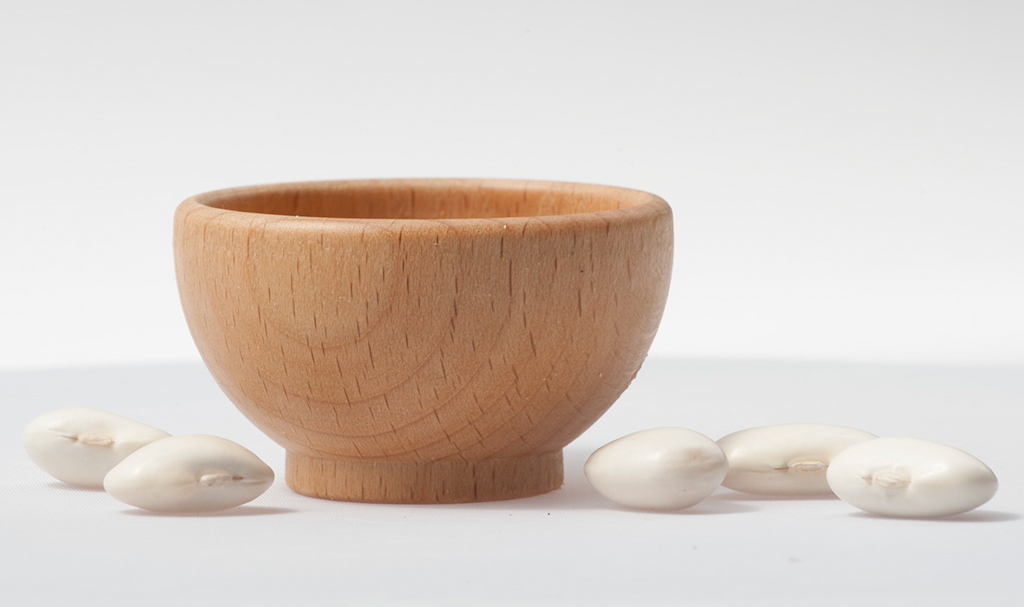 16 neutrale Schalen, 2 Sonderschalen Ahorn, Nußbaum, natur gewachst ø 5,5 cm. 80 getrocknete Bohnen.