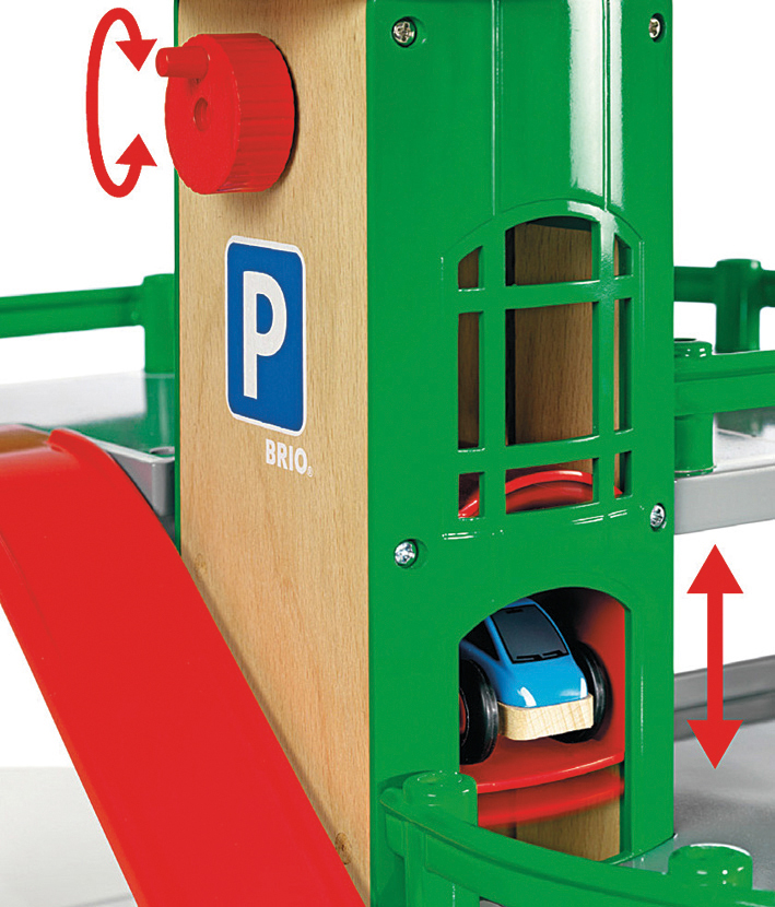 Das Parkhaus kann von allen Seiten bespielt werden. Mit oder ohne Schienen und Straßen kann es in das "Verkehrsrollenspiel" eingebunden werden. Das Parkhaus verfügt über zwei Ebenen, einen Fahrstuhl, eine steile Ausfahrt, sowie eine Tankstelle. Per Knopfdruck kann ein Auto direkt in einen bereitstehenden Eisenbahnwaggon verladen werden. Das Set ist kompatibel mit allen Produkten der BRIO World.