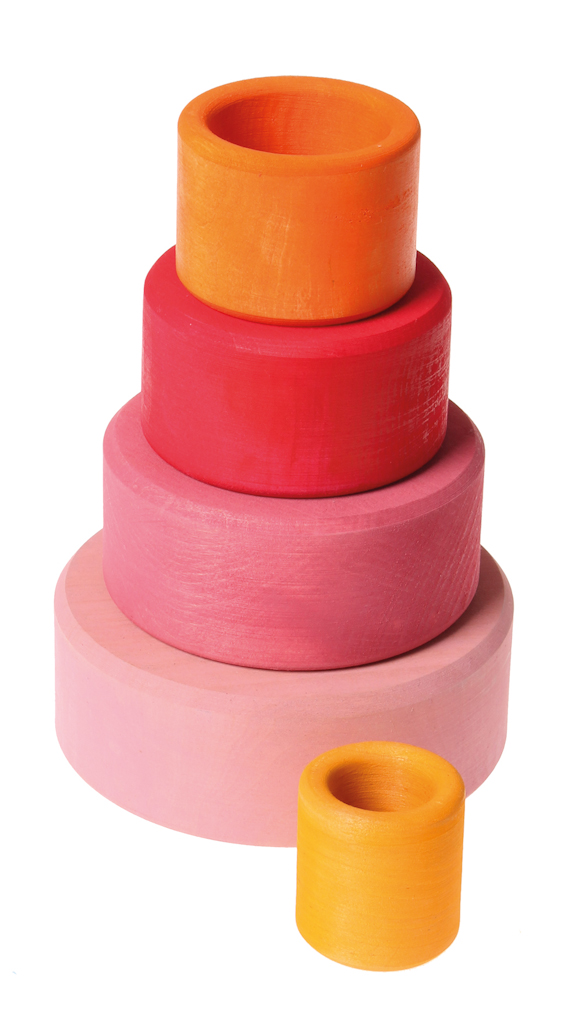 Fünf Schälchen unterschiedlicher Größe zum Ineinanderstecken, Sortieren, Stapeln, Bauen, Zubehör zum Rollenspiel und anderen Bau- und Spielmöglichkeiten.