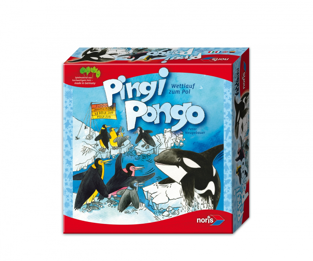 12 Pinguine in 4 Farben + 1 Orca Holz lackiert, 1 Sonderwürfel, Spielbrett 48*48 cm.