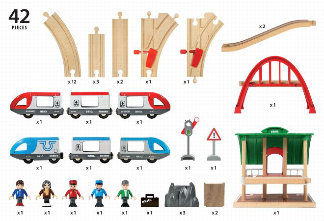 42 Teile. 21 Schienenteile, 1 Bahnhof, 2 Reisezüge, 1 Brücke, 5 Figuren, verschiedenes Kleinteilzubehör. Buche massiv + Kunststoff ABS, PA, TPR, Stahl, Ferrithin. Im Poly-Karton Kiste, die mit Reisverschüssen geöffnet wird. Aufbaumaß ca. 114*73*18 cm.