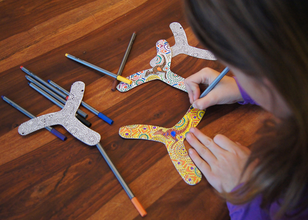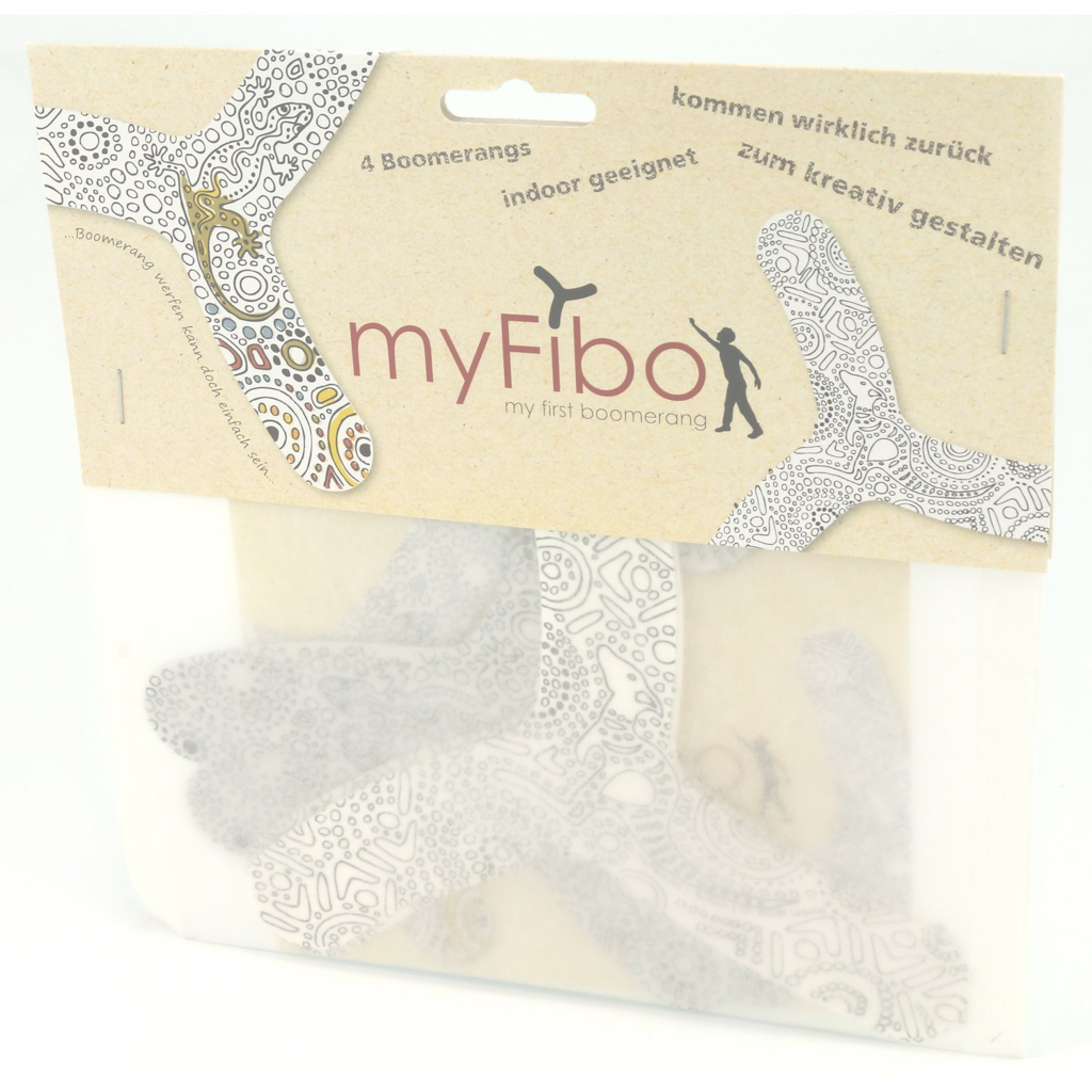 Die für Drinnen geeigneten Bumerangs sind aus stabilem Karton gefertigt. Sie sind für jüngere Kinder und Einsteiger jeden Alters konzipiert, wobei die Bumerangs mit 15 cm Durchmesser für Geübtere gedacht sind. Die Spielanleitung enthält Hinweise für Techniken, Tricks und Hintergrundinformationen. Die Bumerangs können ausgemalt werden.
