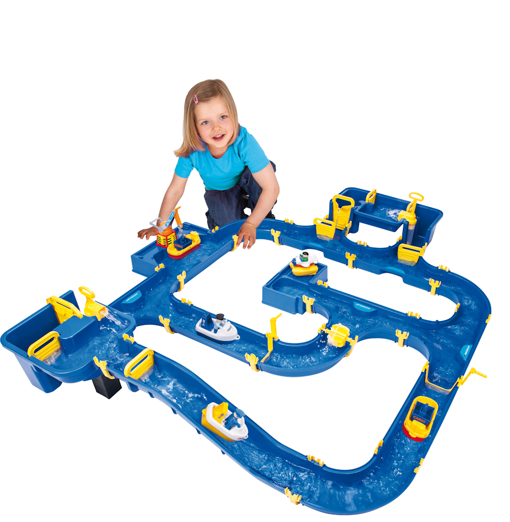 Ein Kanalsystem zum Zusammenstecken mit Dichtungen wird mit Wasser befüllt. Verschiedene Aufbaumöglichkeiten mit Ergänzungen, wie Kurven, Straßen, Pumpen, Wasserfällen, Booten oder Figuren ergeben vielfältige Spielmöglichkeiten.