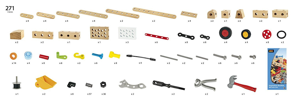 271 Teile, incl. 1 Hammer, 2 Zangen, 2 Schraubenzieher, 2 Schraubenschlüssel. FSC Holz. Im Pappkoffer mit Tragegriff.