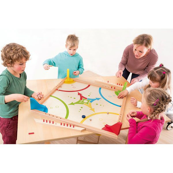 Bei diesem Geschicklichkeitsspiel ist Reaktionsvermögen und Schnelligkeit gefragt. Die Spieler versuchen mit Hilfe der Rutschen und Metallkugeln die Holzscheibe in das gegenüberliegende Zielfeld zu bewegen. Für jeden Treffer in das Zielfeld erhält der Spieler einen Punkt. Derjenige, der zuerst fünf Treffer erzielen kann, gewinnt.