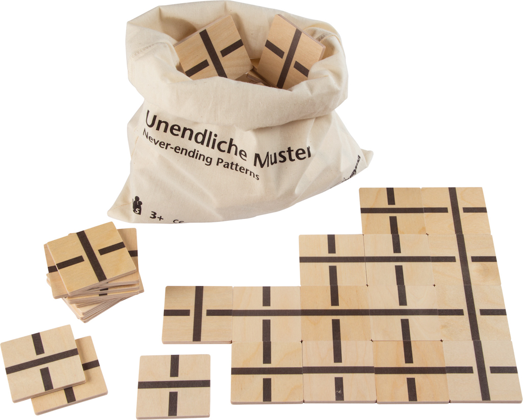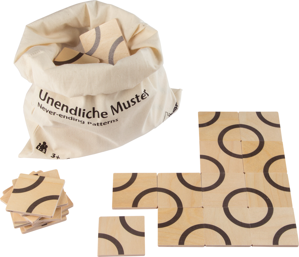 Die einzelnen, unterschiedlich gemusterten Plättchen inspirieren unendliche Muster, Formen und Figuren zu legen und dabei immer wieder neue Strukturen zu entdecken. Das Spiel kann in Gruppen oder alleine gespielt werden. Aufgrund der großen Anzahl der Plättchen kann auf einer großen Fläche oder auf dem Boden gespielt werden.