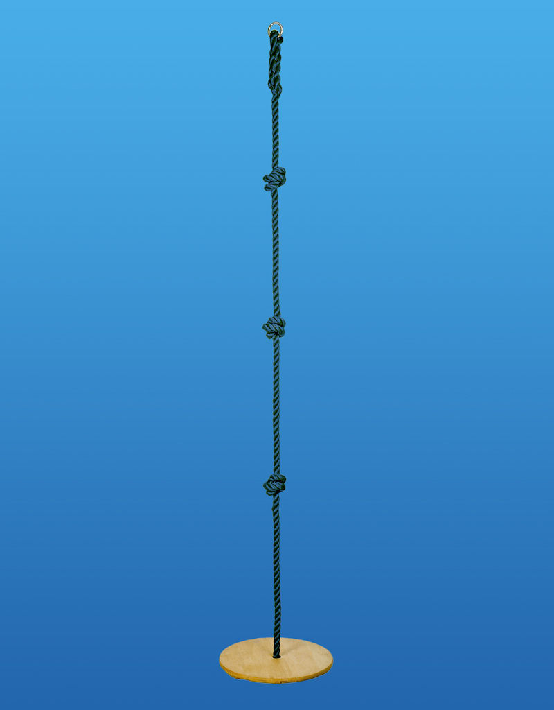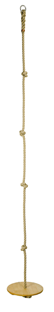 Schaukelsitz Birkenholz lasiert, ø 33 cm. Seile PP ø 20 mm, Klettertau L 170 cm oder 190 cm oder 250 cm mit 3 bzw. 4 Knoten. Metallring + Drehwirbel galvanisch verzinkt. Belastbar bis 50 kg.