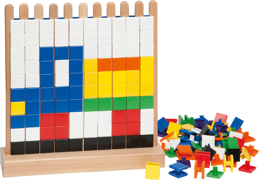 Quadraximo ist ein vertikales Legespiel und fördert das Vorstellungs- und Abstraktionsvermögen. Mit den Motiv-Vorlagen in den Anleitungsheften lernt das Kind die genaue Bestimmung von Position und Farbe und logisches Denken wird geschult. Die Kunststoffplättchen können auseinander genommen und mit anderen Farben zusammen gesteckt werden. Dann sind Vorder- und Rückseite unterschiedlich und das rückwärtige Bild am Kammständer sieht anders aus.