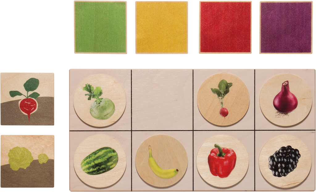 Mit dem Zuordnungsspiel wird elementares Wissen um Herkunft, Art und Aussehen von Lebensmitteln vermittelt. Es eignet sich sehr gut zum Benennen und sprachlichen Austausch. Wortschatz und Wissen werden erweitert. Wachsen Bananen auf dem Baum? Wo wachsen Kiwis? Wie sehen Radieschen innen aus? Haben Gurken Kerne? Es kann sowohl mit Erwachsenen, als auch als freies Sortier- und Legespiel eingesetzt werden. Durch die realistische Fotodarstellung der Nahrungsmittel auf den Bildkarten und die Vielseitigkeit hat das Spiel einen hohen pädagogischen und ästhetischen Wert. Schon die Kleinen haben Spaß daran, Obst und Gemüse nach Farben und Aussehen zu sortieren. Anspruchsvoller wird es, wenn mehrere Kategorien auf den Tafeln zugeordnet werden sollen: Welche Früchte wachsen auf dem Baum und welches Gemüse wächst über oder unter der Erde? Gehört die Birne zum Obst?