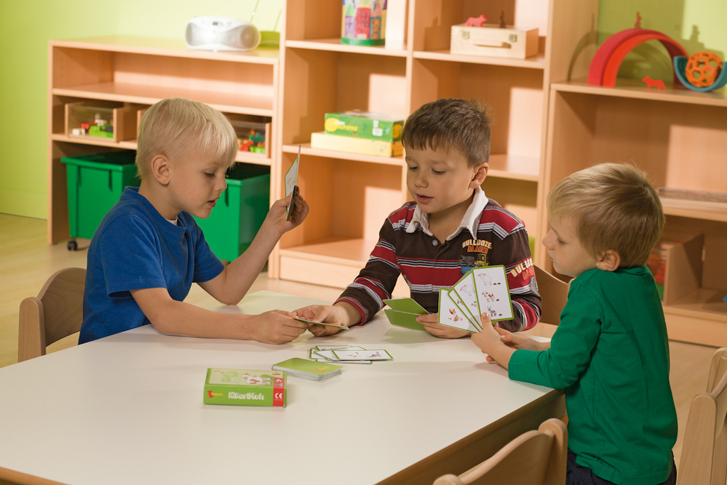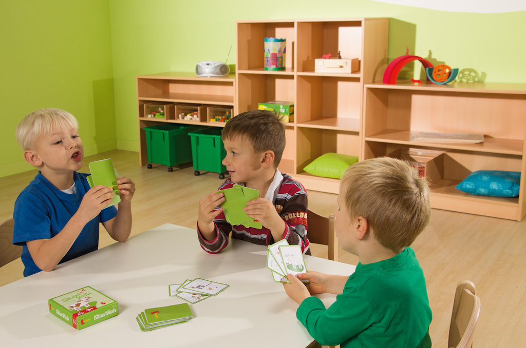 Einfache Spiele mit kurzer Spieldauer, erste Erfahrungen mit Spielregeln werden gemacht. Die Themen und die Gestaltung sind altersentsprechend.