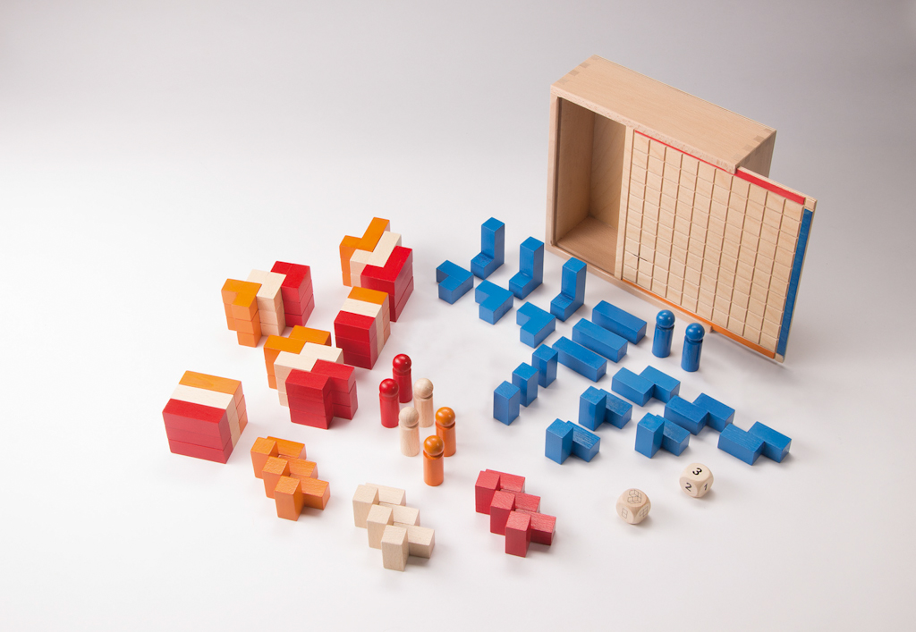 72 Spielsteine (je 18 Steine in einer Farbe), 8 Spielfiguren (je 2 in einer Farbe, Buche massiv), 1 Würfel Ziffern 1-3, 1 Würfel mit 6 Formen (Ahorn massiv). Spielbrett 22*22 cm. Im Holzkasten Buche massiv mit Schiebedeckel (Birke Sperrholz). 23*23*10,5 cm.