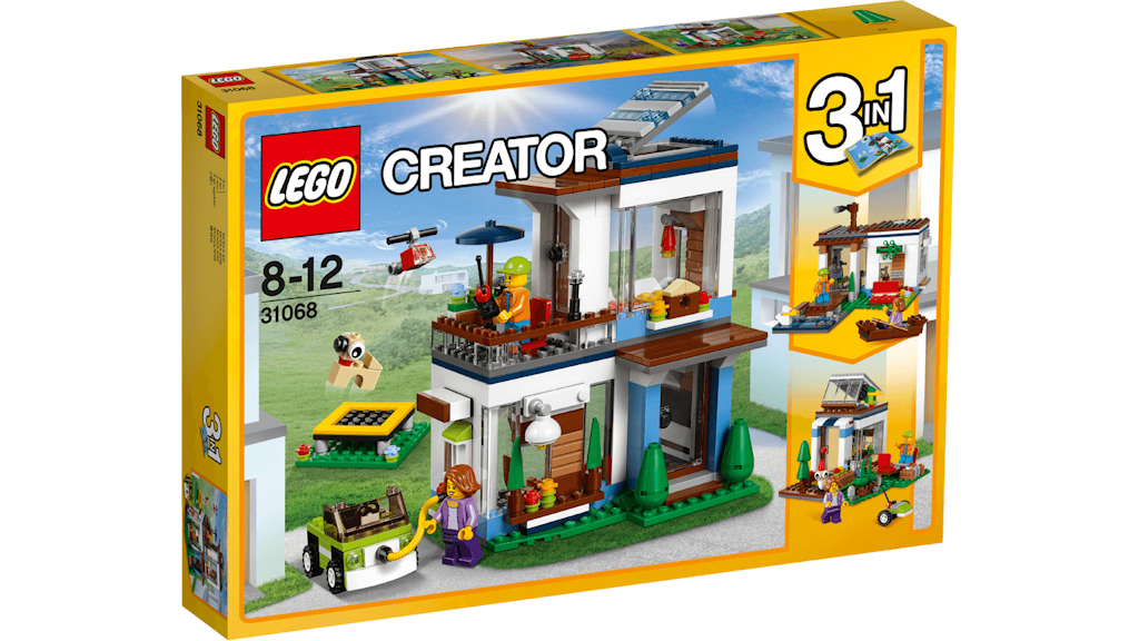 Creator 3-in-1-Modell: Das moderne Zuhause kann in ein Haus am See oder ein Haus mit Garten umgebaut werden. Die baubaren Module lassen sich auch anders kombinieren, um eine Dachterrasse zur erschaffen. Und das Fenster, die Tür und weitere Modulsegmente können leicht ausgetauscht werden, um das Haus ganz individuell zu gestalten. Kombiniert mit den ebenfalls aus Modulen aufgebauten LEGO® Creator Sets 31067 und 31069 bietet es viele weitere Bau- und Spielmöglichkeiten. Das Moderne Zuhause verfügt über eine glatte Fassade mit großen Fenstern, ein Solardachfenster, ein Schlafzimmer und einem Balkon mit Sonnenschirm im Obergeschoss sowie einem Wohnraum im Erdgeschoss. Draußen gibt es eine Wandlampe zum Zusammenbauen, einen Garten mit Trampolin, Blumen und Bäume sowie eine Ladestation und ein Elektroauto mit Minifiguren-Cockpit. Zur Einrichtung gehören zwei Betten, ein Sofa und ein Sessel. Enthält einen Spielzeughubschrauber und eine Hundefigur zum Zusammenbauen.