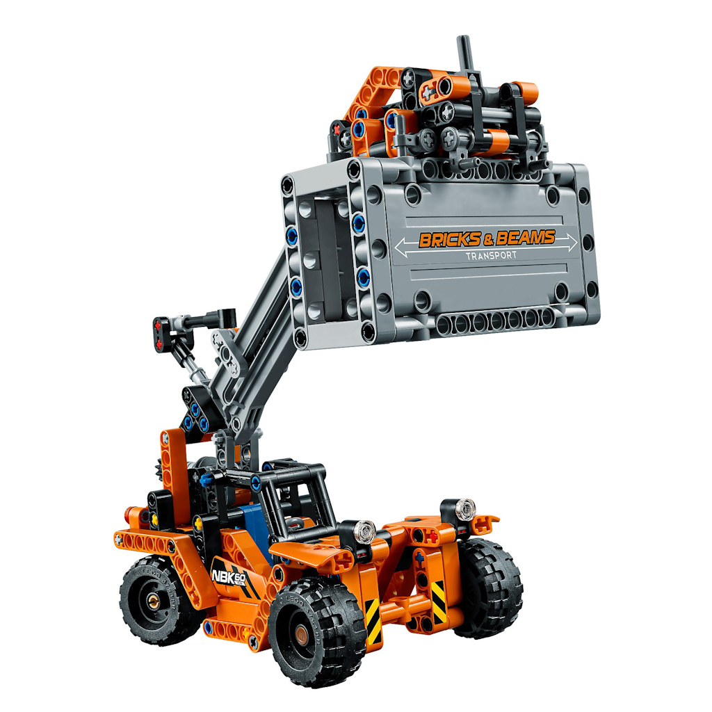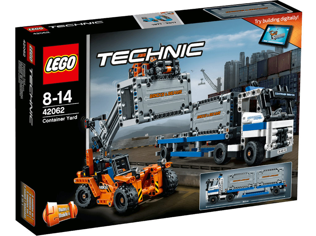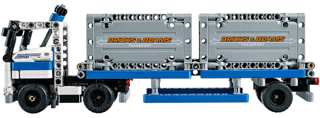 2-in-1-Modell: Das Set Container-Transport enthält einen Sattelschlepper mit funktionierender Lenkung, aufklappbaren Türen, abkoppelbarem Sattelauflieger und zwei Container zum Aufladen. Das Set Containerlader mit funktionierender Lenkung und einem ausfahrbaren Ausleger mit funktionierendem Greifer. Dieses Set kann in einen Portalhubwagen mit Lastwagen und Container umgebaut werden. Um die beiden Modelle bauen zu können, müssen die digitalen 3-D-Bauanleitungen aus der interaktiven LEGO App befolgt werden, die kostenlos online erhältlich sind. In dieses Modell ist auch ein besonders verzierter Stein eingebaut, der zur Feier des 40-jährigen Jubiläums von LEGO® Technic entwickelt wurde.