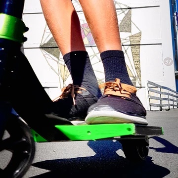 Der stabile Scooter hat ein besonderes Format: er ist kurz und breit. Durch dieses Spatch-Deck können die Füße nebeneinander stehen und der Körper gerade ausgerichtet werden. Der Scooter ist für Carving und Coasting geeignet, sowie für Downhill Fahrten, Funparks oder Pumptracks. Schutzkleidung wird empfohlen.