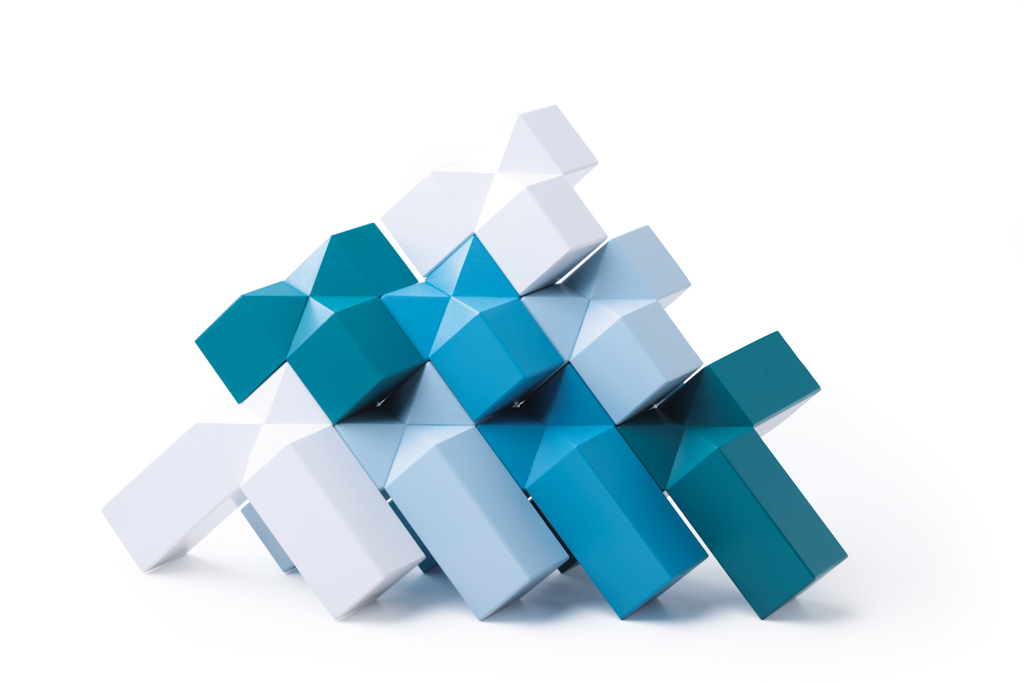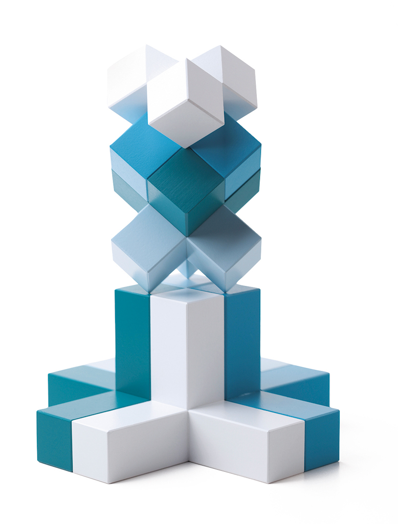 Die Bausteine bestehen aus zusammengesetzten Quadern, wovon es zwei Formen gibt. Diese lassen sich zu überraschend vielfältigen Bauwerken gestalten. Die außergewöhliche Farbgestaltung harmoniert schön miteinander und unterstreicht die Besonderheit der Formen.