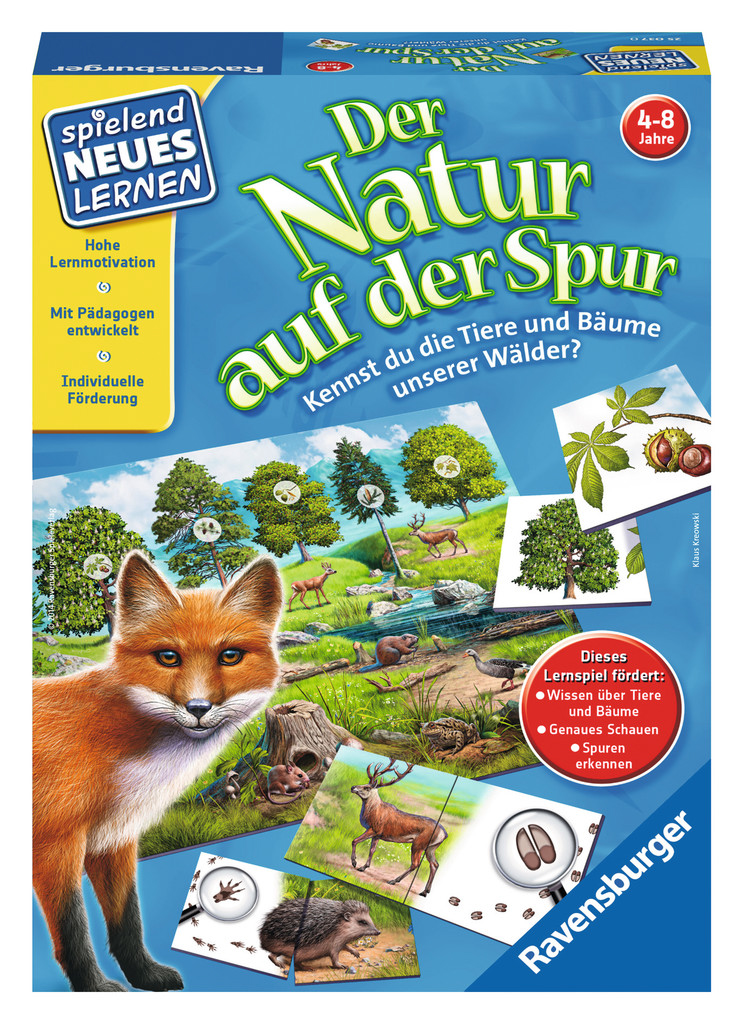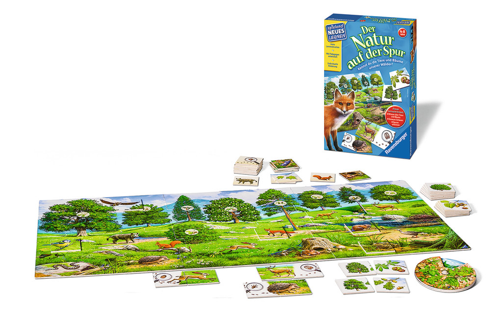 28 Tierkarten, 18 Baumkarten, 4 Müllkarten, 1 Drehscheibe, 6-tlg. Spielplan. 76*34 cm.