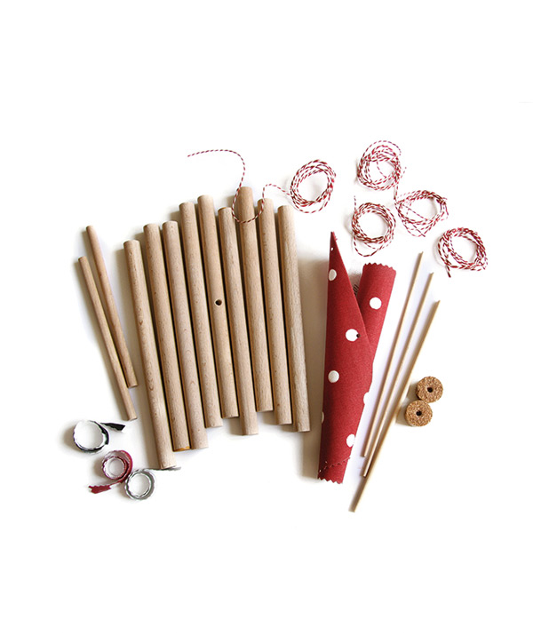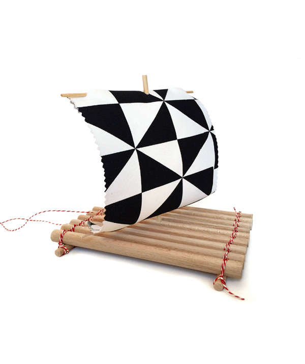 25 Teile: 11 Rundhölzer Buche, 5 Schnüre Hanf, vorgelochter Stoff Baumwolle, 2 Holzstäbe, 1 Segelmast, 2 Korken, 3 Stofffähnchen. 23*16*3 cm.