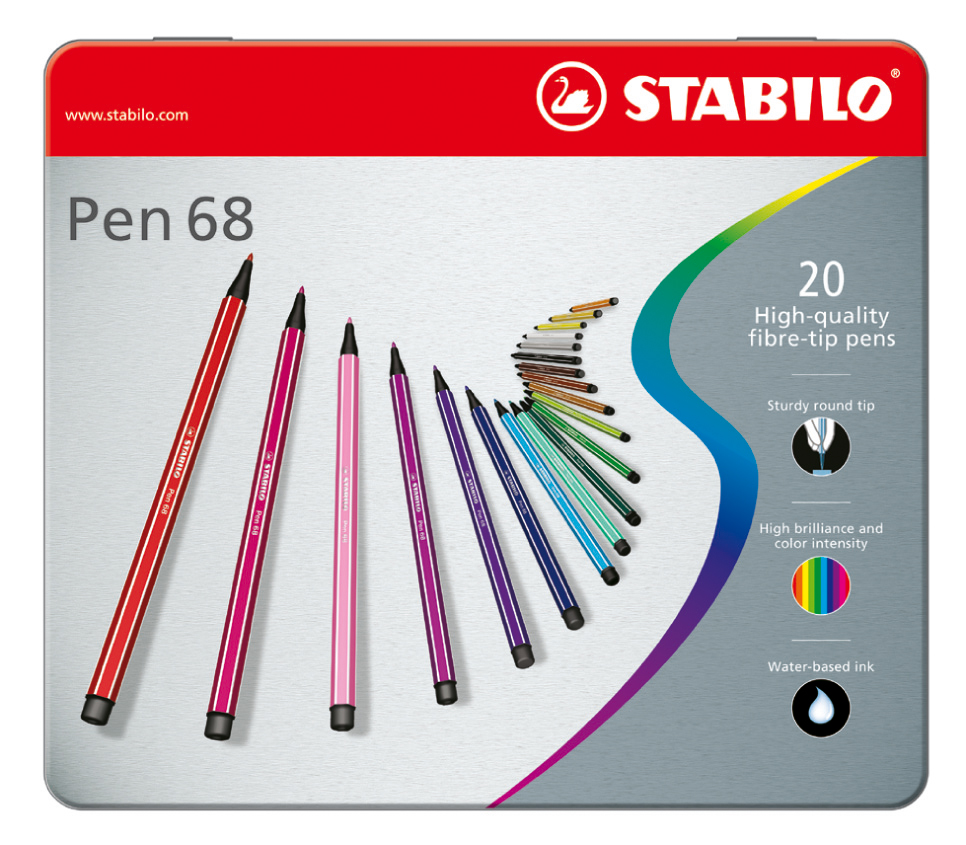Der Fasermaler ist farbintensiv und für kräftige Linien und deckende Flächen geeignet. Die robuste M-Spitze ist formstabil (ca. 1 mm Strickstärke) und sorgt für eine gleichmäßige Farbabgabe. Die Kappe ist beim Malen am Stiftende aufsteckbar. Die auf Wasser basierende Tinte lässt sich auch mit Wasser vermalen. Das gibt interessante Effekte und erlaubt auch Farbüberläufe. Die Spitze des Fasermalers ist vor Austrocknung geschützt. Die Anti-Dry-Out-Technologie erlaubt es, den STABILO Pen 68 bis zu 24 Stunden offen und ohne Verschlusskappe zu lagern. Ungestörtes Arbeiten mit unterschiedlichen Farben ist also auch über einen längeren Zeitraum ohne lästige Handgriffe möglich.