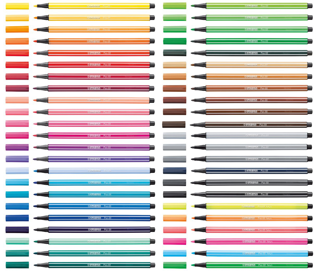 Stifte mit geruchsneutraler Tinte auf Wasserbasis (bis zu 24 Std. offenlagerfähig). 12, 18, 24 Farben im Kartonetui. 6, 8, 10, 15 20 Farben in Kunststoffetui. 10, 15 oder 20 Farben im Metalletui (Gehäuse/Stiftkappe PP). Einzelfarben erhältlich (40 verschiedene Farben + 6 Leuchtfarben + 10 Neonfarben + 8 Pastellfarben).