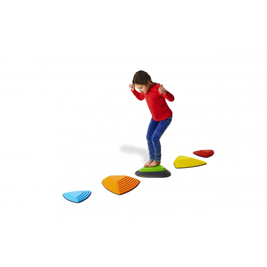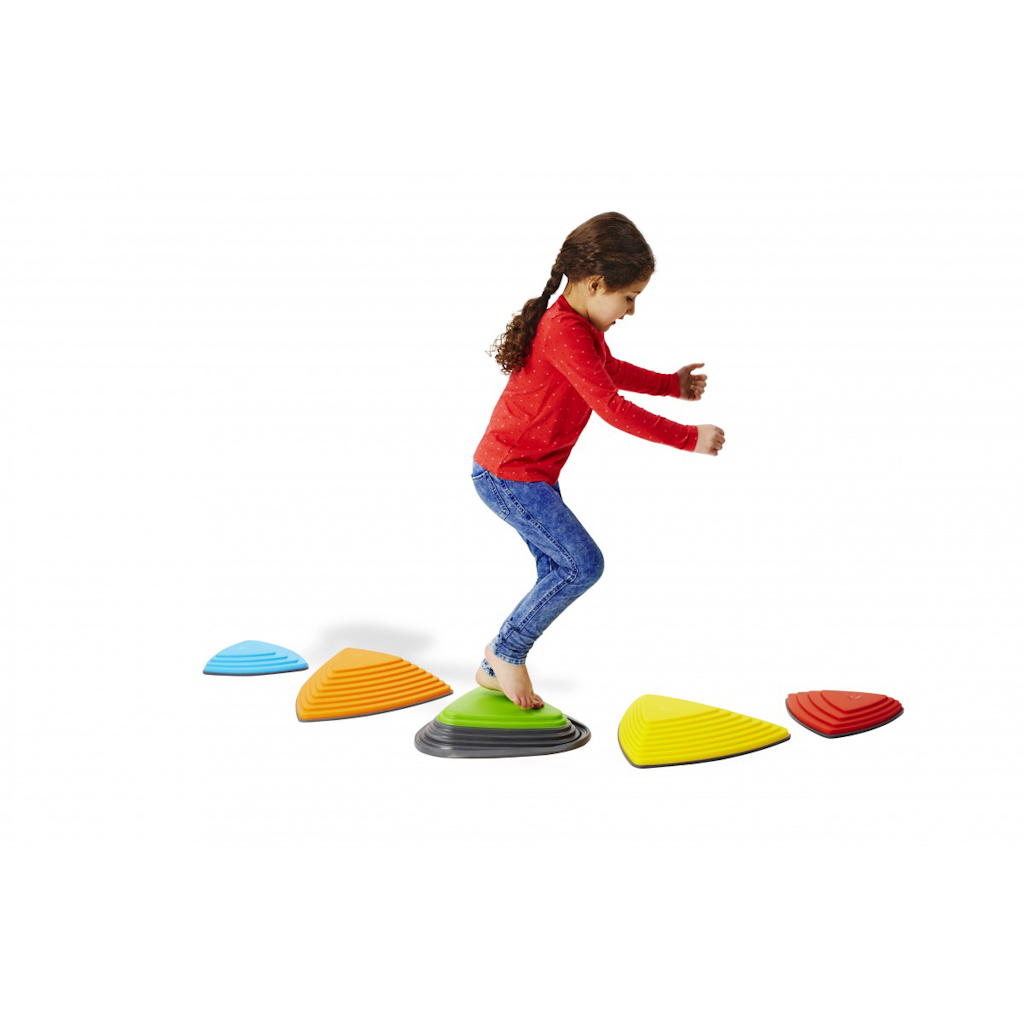 Diese neue Version des River Stone Sets verfügt über eine weiche Basis und eine Hardtop-Plattform, die von drei starken Stahlfedern unterstützt wird, um das Springen zu ermöglichen. Das Springen und Hüpfen auf dem Bouncing River Stone ist körperlich herausfordernder, da Hüpfen eine Anpassung durch die Knöchel und Beine erfordert, was den propriozeptiven Sinn stärkt. Im Set sind neben dem River Stone noch vier andere Steine zum Balancieren.