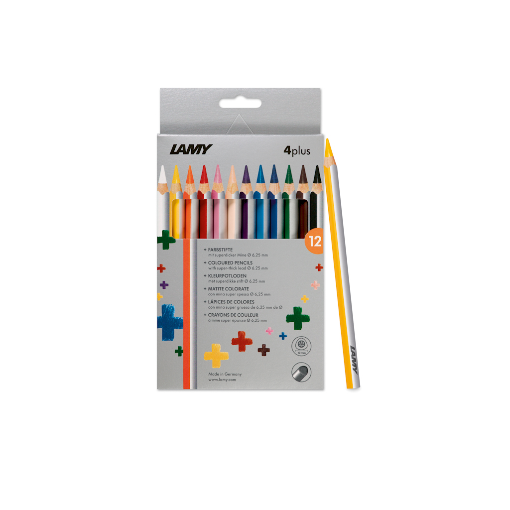 Farbstifte Zedernholz lackiert, abgerundete Dreieckform. L 17,5 cm. ø Mine 6,25 mm. 6 + 12 Farben im Kartonetui, 12 Farben im Metalletui + 12 Farben in Stoffrolle mit Spitzer. Einzelstifte erhältlich.