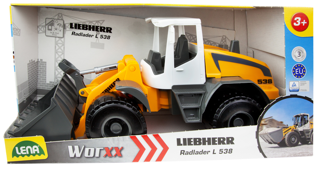 Der Radlader ist originalgetreu gestaltet und zum Spielen für drinnen und draußen geeignet. Radladerschaufel und -arm sind. Die Vorderräder sind lenkbar. Die Funktionen sind wie das gesamte Fahrzeug robust und stabil.