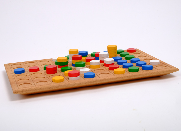 Je 20 Holzscheiben in 5 Farben Buche lackiert im Baumwollsäckchen. Spielbrett Buche massiv, geölt, 32*20 cm.
