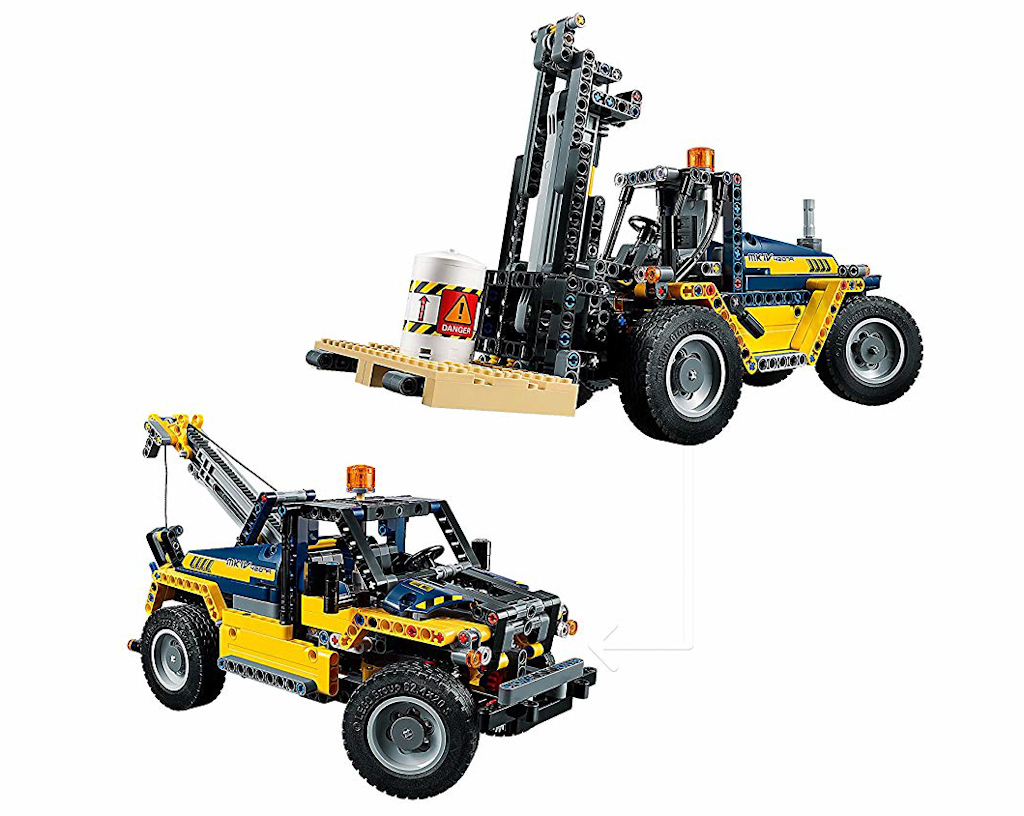 Das LEGO® Technic 2-in-1-Set lässt sich in einen Abschleppwagen umbauen. Für den anspruchsvollen Zusammenbau sind die Tüten nummeriert und mit den fertigen Modellen kann gespielt werden. Der Schwerlast-Gabelstapler verfügt über eine detailreiche Fahrerkabine, eine orange Warnleuchte, große Reifen und eine Gabel, die große Höhen erreicht. Beim Schieben des Fahrzeugs, bewegen sich die Kolben des Motors, die Gabel kann angehoben und geneigt werden. Mit Hinterradlenkung, 2-Zylinder-Motor und Palette. Das Set enthält außerdem einen Transportbehälter mit Gefahrgutkennzeichnung und Aufkleber, um weitere Details darzustellen.