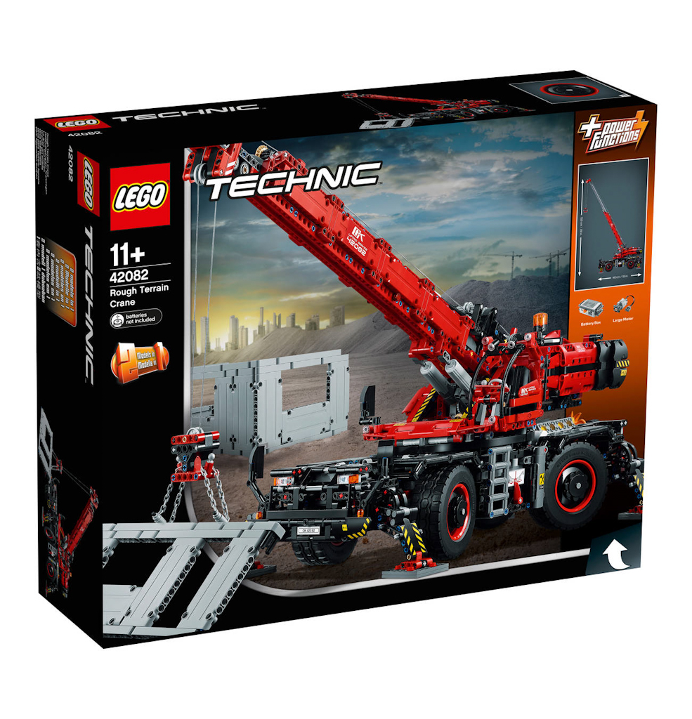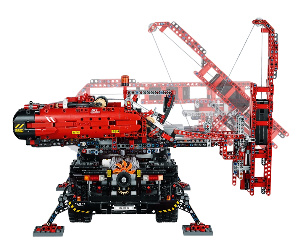 Der Zusammenbau des geländegängigen Kranwagens stellt eine besondere Herausforderung für alle technikbegeisterten Lego Konstrukteure dar. Er ist mit LEGO® Power Functions ausgestattet und lässt sich in einen mobilen Freifallhammer umbauen. Der große Motor dient zur Steuerung der oberen und unteren Funktionen des Krans und kann leicht bedient werden. Die Stützfüße können herunter gelassen werden, der Aufbau lässt sich um 360 Grad schwenken, die Hubwinde kann betätigt und der Ausleger bis zu einem Meter ausgefahren werden. Manuelle Funktionen: Allradlenkung, Allradantrieb, detailreicher V8-Motor mit beweglichen Kolben und drehendem Lüfter, verstellbare Außenspiegel und eine aufklappbare Kabinentür. Die Baumodule können an den Haken genommen werden. Mit Staufächern zum Öffen, bestückt mit Ketten und Werkzeugen, sowie einem Feuerlöscher.