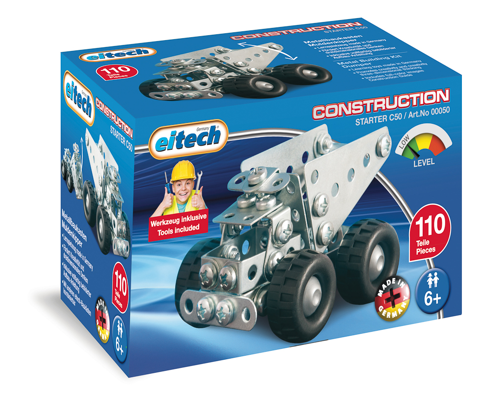 Die Packung enthält Material und Anleitung zum Bau eines Muldenkippers. Die Stahl-Winkel, Bleche und Streben werden mit Schrauben und Muttern verbunden. Nach Fertigstellung eines Bauwerkes lässt sich die Konstruktion auch einfach wieder zerlegen. Diese Art Konstruktionsmaterial erfordert Geduld und auch Übung und ist empfehlenswert für Kinder, die gerne mit Schraubenzieher und -schlüssel umgehen. Kinder können mit dem Material aber auch frei bauen und konstruieren und sollten darin auch unterstützt werden.