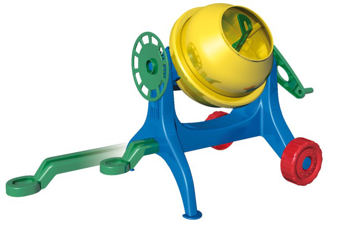 Der Betonmischer erweitert das Spielthema Baustelle im Sandkasten. Kinderhände können Kurbel und Drehrad gut bedienen und den Mischvorgang mit Einfüllen, Mischen, Auskippen realitätsnah nachspielen.