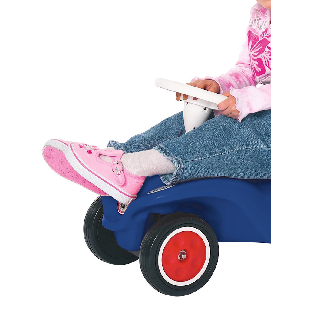 Mit diesem Kleinkind-Auto können Kinder ab dem Laufalter fahren, wenn sie selbstständig auf- und absteigen können. Neben dem Design wurden alle wesentlichen Merkmale des Klassikers wie die Form, die Beinauflage und die Kniemulde für größere Kinder beibehalten. Das BIG-New-Bobby-Car verfügt serienmäßig über ein ergonomisches Sicherheitslenkrad mit mechanischer Hupe und breite Flüsterräder, die für eine gute Straßenlage und leise Fahrgeräusche sorgen. Unter dem Tacho verbirgt sich ein Geheimfach zum Verstauen kleiner Utensilien. Zudem gibt es je eine Anhängerkupplung vorne und hinten.