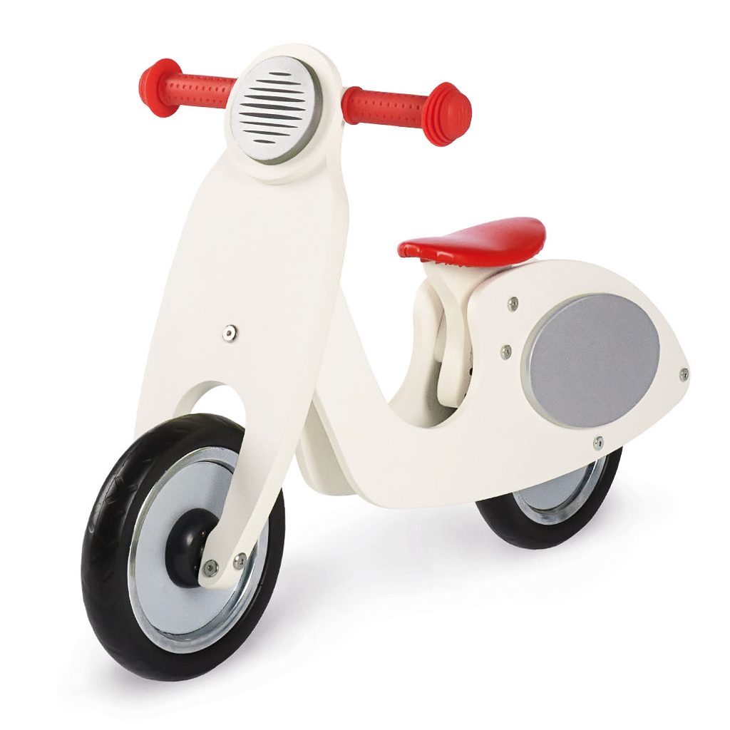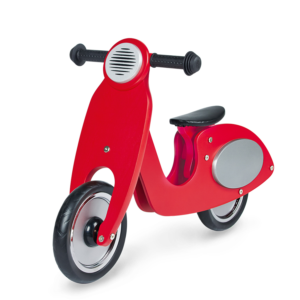 Korpus Birkenschichtholz, Lenkstange Buche massiv, lackiert. Sattelpolster PU, Griffe TPE, Reflektor PE, Felge + Schrauben Stahl, Reifen EVA+PU, Achse Nylon. 77*34*51 cm.