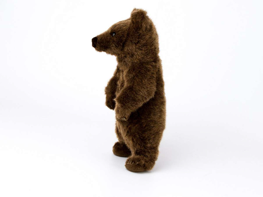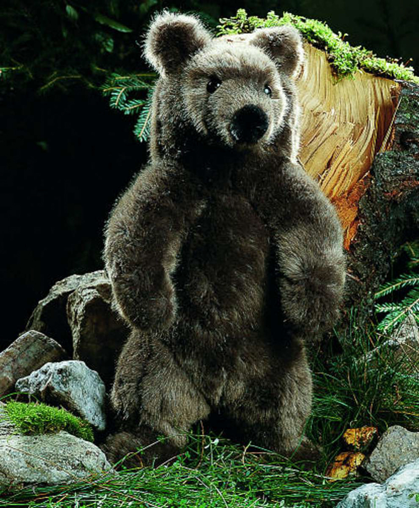 Webpelz braun, Polyesterfüllung. Sicherheitsaugen PMMA, Federstahl verzinkt (Befestigung für Augen), Altmessing Nickelfrei (Logo). Bemalung Wasserfarben, Acryl. Handwäsche.Gewicht 250 g. 15*18*39 cm